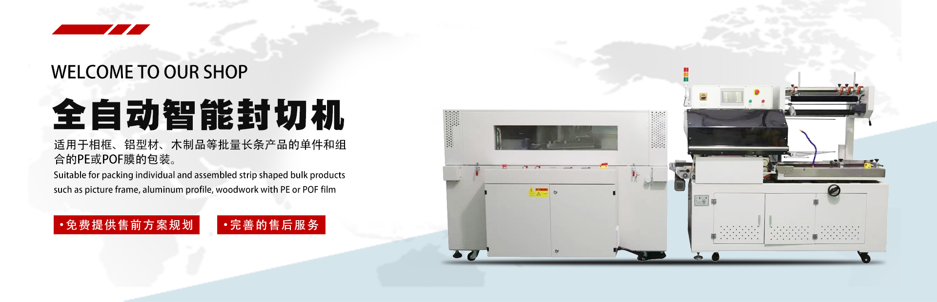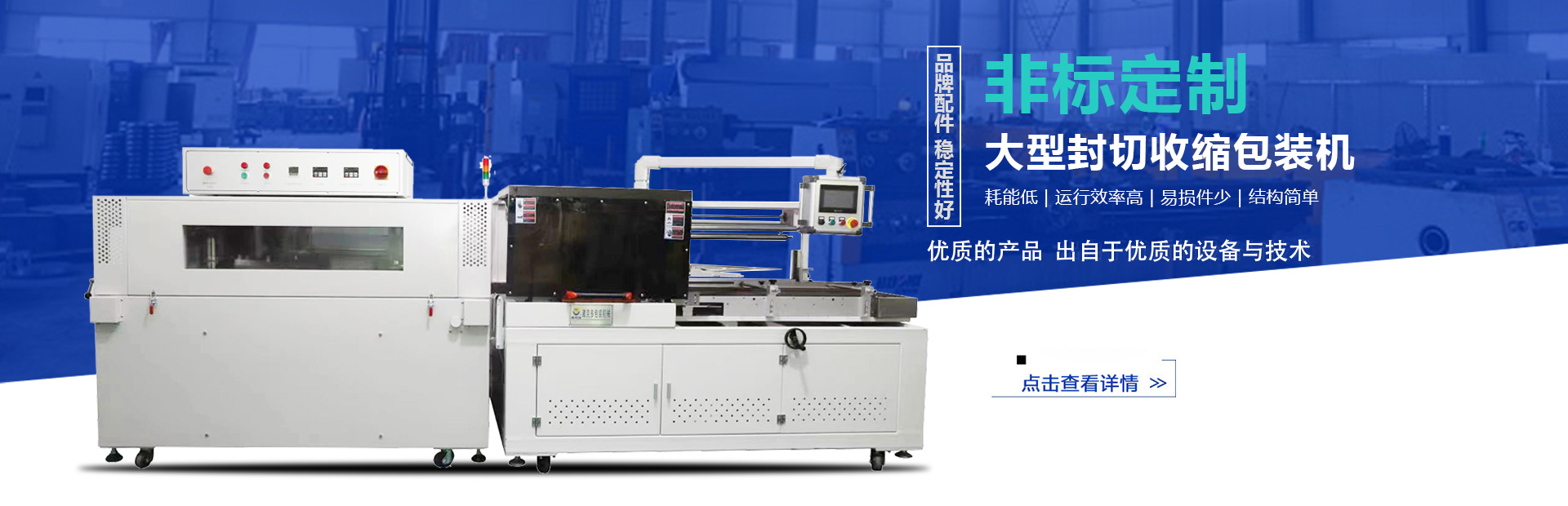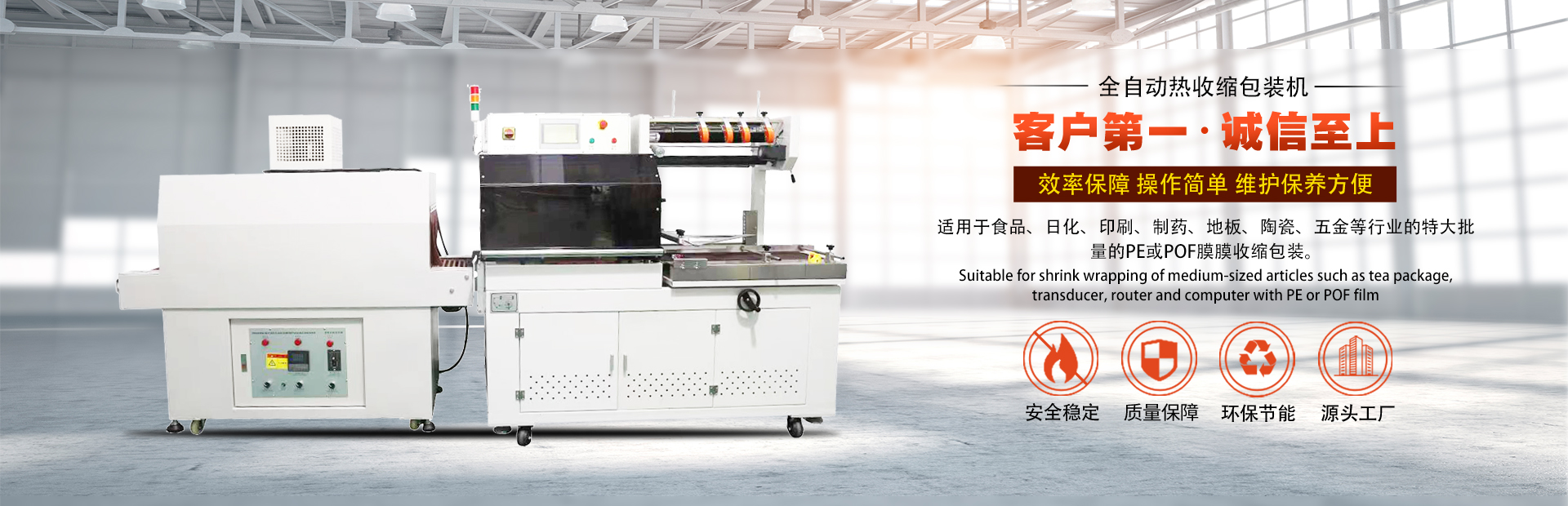 公司主營(yíng)產(chǎn)品:封切收縮包裝機(jī)、袖口式包裝機(jī)、集開(kāi)箱--裝箱--封箱--貼標(biāo)--機(jī)器人碼垛--纏繞包裝于一體的智能后道無(wú)人化包裝生產(chǎn)線(xiàn)。